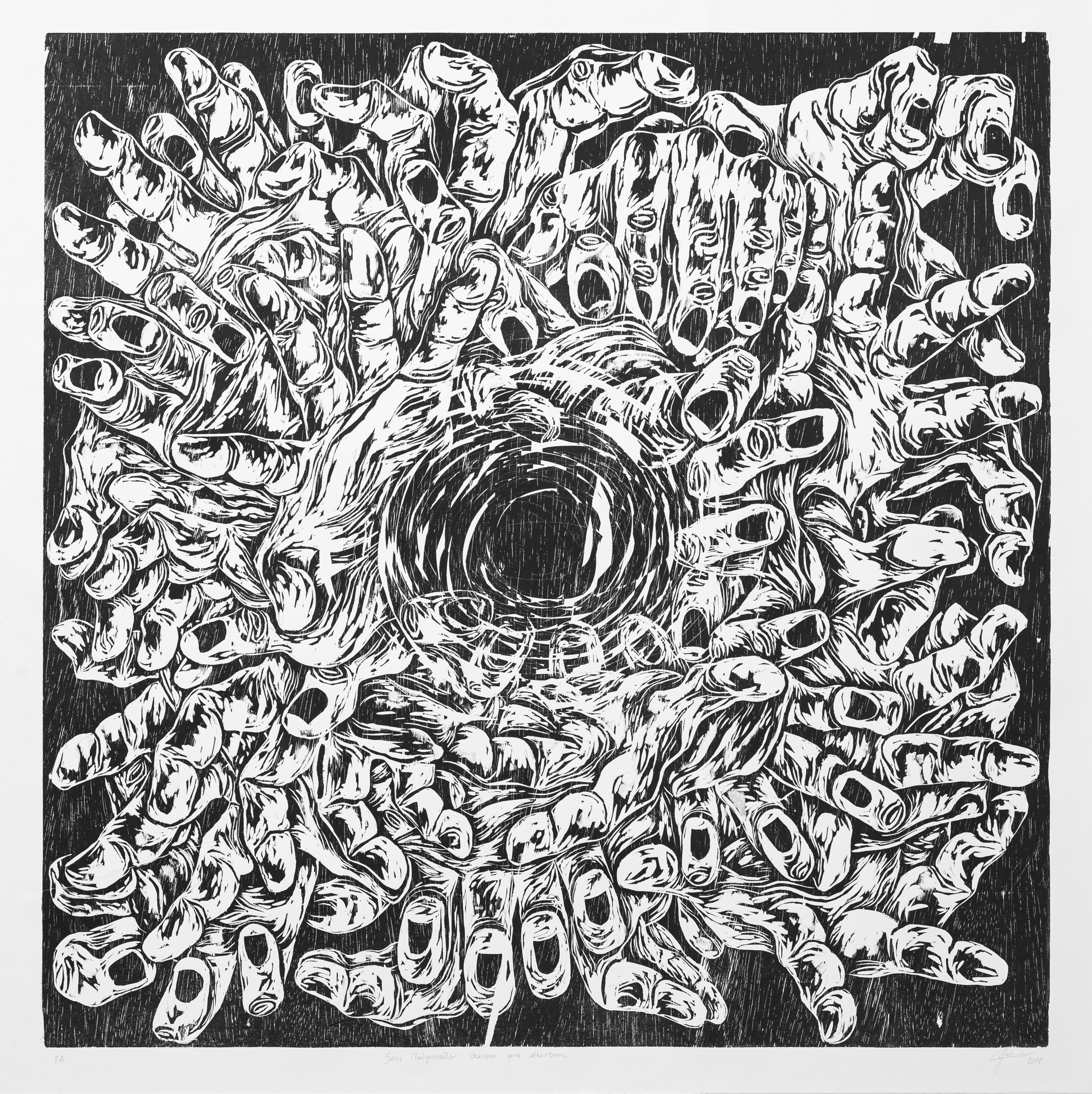 Julia Bastos: as mãos que despontam nas xilogravuras de Julia não acalentam, são muitas mãos sem corpo e inúmeros dedos sem garras, que contornam o perímetro de um ser. Seus trabalhos refletem uma identidade que habita um corpo e negocia existencialmente sua liberdade de ser. Nas gravuras mais recentes da artista, formada em artes visuais pelo Centro Universitário Belas-Artes de São Paulo em 2018, surge uma fusão orgânica entre a estrutura humana e o mundo vegetal, em que a necessidade de defesa e proteção se elabora por meio de uma analogia com a morfologia feminina e os espinhos que as plantas desenvolvem para se defender.